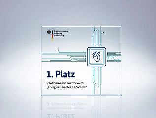 Creating an energy efficient chip, which can classify ECG signals into healthy and arrhythmical using neural networks, was the goal of the first challenge for disruptive innovations in energy-efficient AI hardware initiated by the German Federal Ministry of Education and Research (BMBF). The Project Team „Low-Power Low-Memory Low-Cost ECG signal analysis using ML algorithms (Lo3-ML)“ under the Leadership of Prof. Dr. Dietmar Fey, Dr. Marc Reichenbach (Chair of Computer Science FAU), Prof. Dr. Dr. Robert Weigel (Chair of Electronics FAU), Dr. Marco Breiling (Fraunhofer IIS Erlangen) and Prof. Amelie Hagelauer (Chair of Communications Electronics, University of Bayreuth) won the first price in the category “ASIC 130 nm”. Federal minister Anja Karliczek presented the award in a virtual award ceremony on March 18, 2021. The design combines a data flow driven architecture, non-volatile, multi-level RRAM memory and a division into two parts with a specifically adapted NN training algorithm. It achieves a very low power consumption and can be applied in a wearable use case.